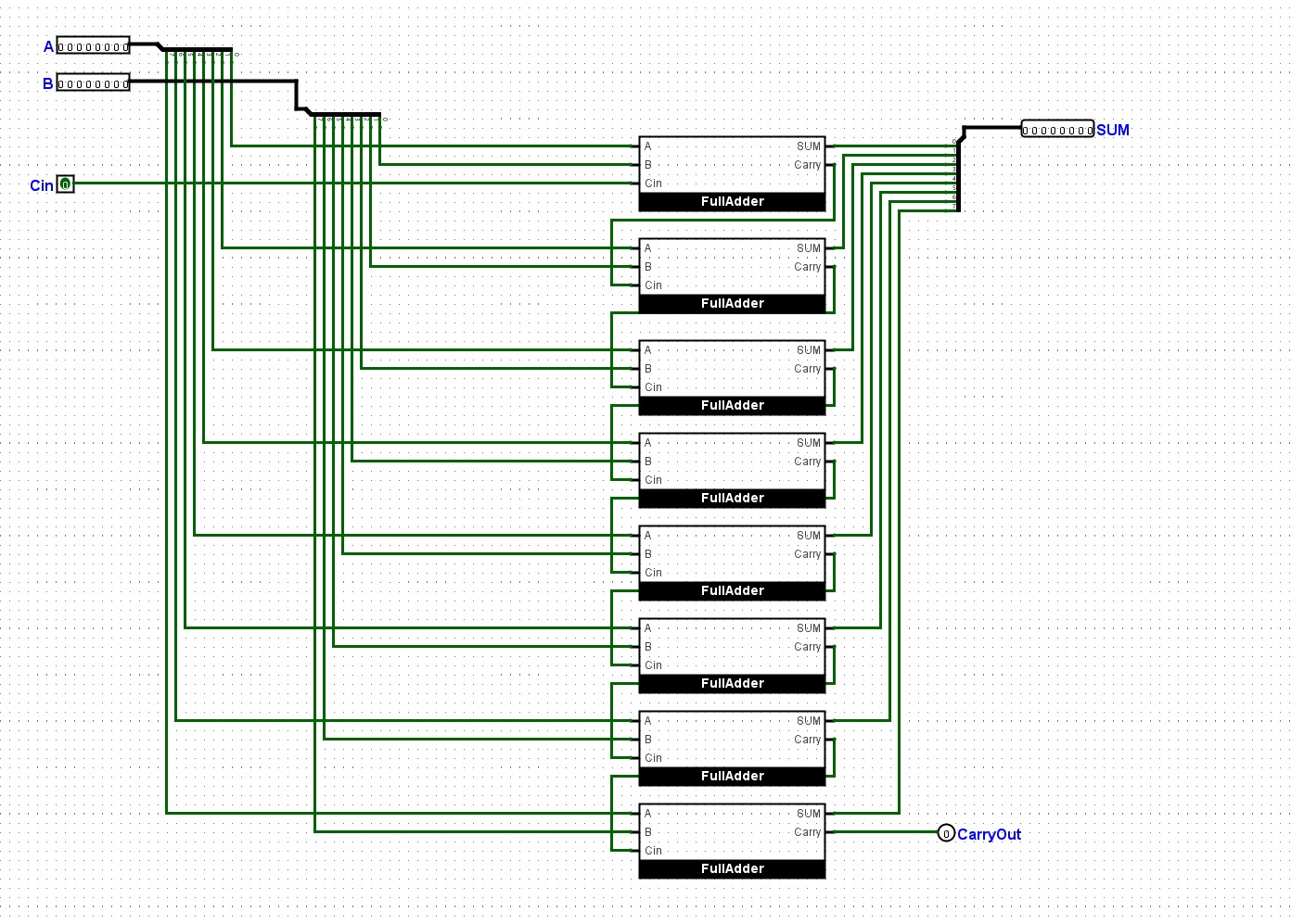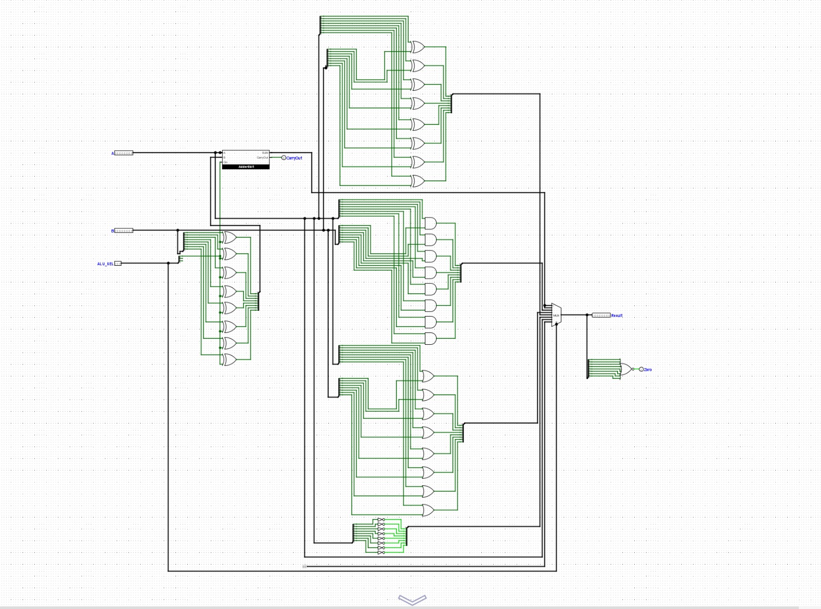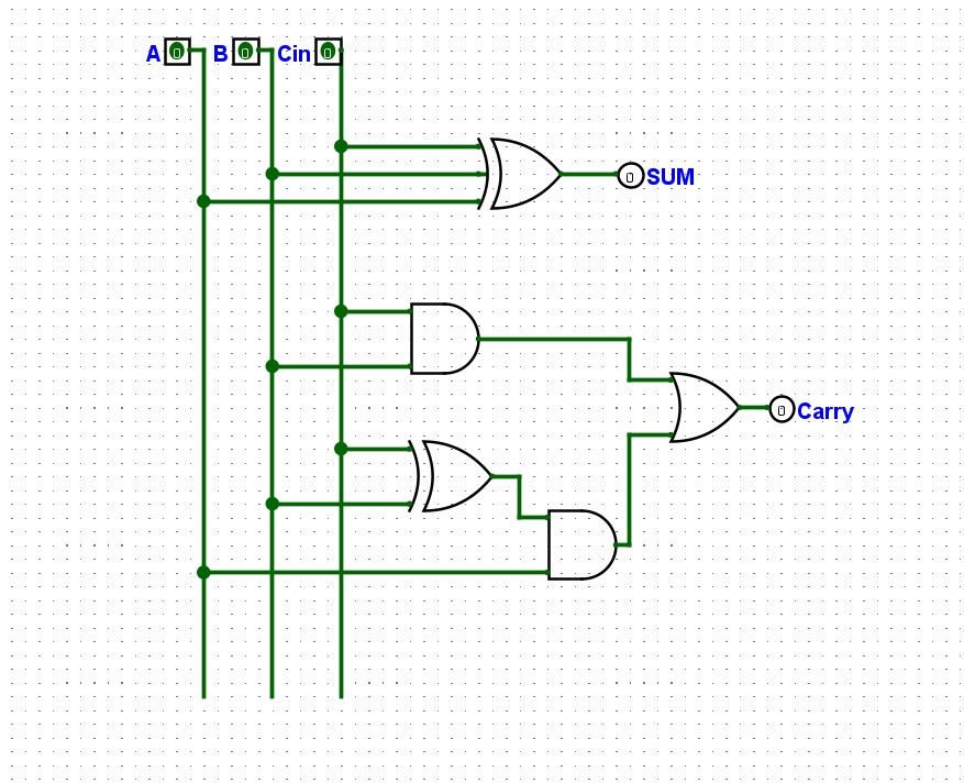 The Arithmetic Logic Unit supports eight arithmetic and logical operations, with carry-out and zero flags for conditional branching. At its core lies a gate-level full adder, which serves as the building block for multi-bit operations.