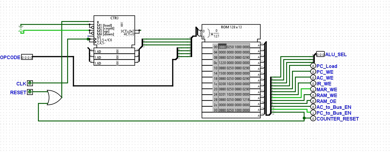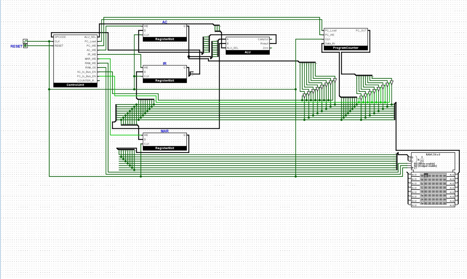 The complete system combines the control logic, arithmetic unit, and register modules. A common 8-bit data bus interconnects all subsystems, enabling seamless transfer of instructions and data between memory, the ALU, and registers.